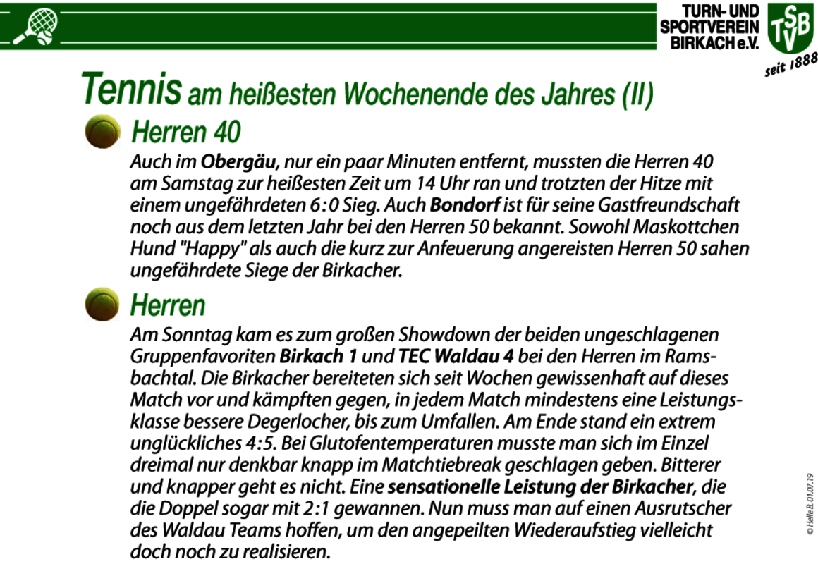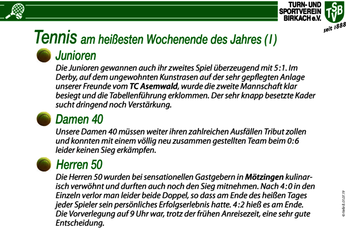 3:2 Bilanz für Birkacher Tennisteams am heißesten Wochenende des Jahres