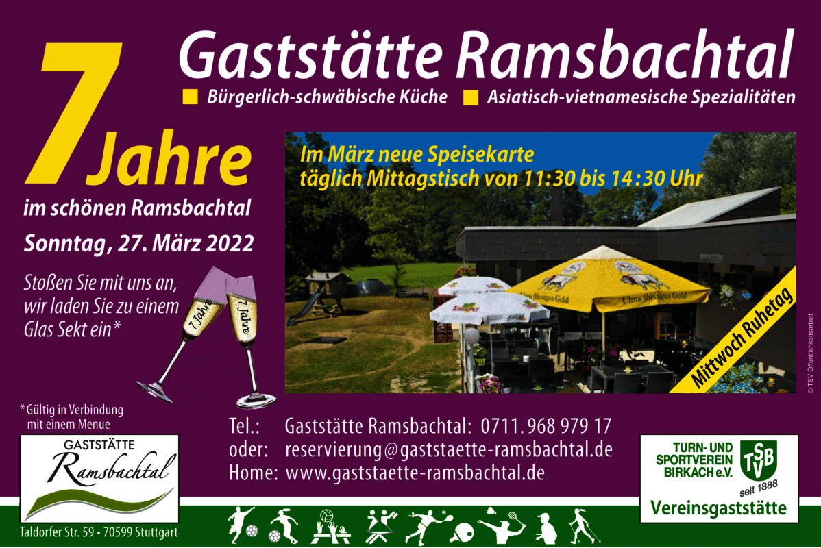 Seit 7 Jahren bewirtschaften wir das Vereinslokal des TSV Birkach im schönen Ramsbachtal. Dies nehmen wir zum Anlass, am Sonntag, den 27. März 2022 mit Ihnen zusammen auf dieses kleine Jubiläum anzustoßen und Ihnen für Ihre Treue zu danken. Wir freuen uns, Sie auch künftig in den Räumen der Vereinsgaststätte begrüßen und bewirten zu dürfen.