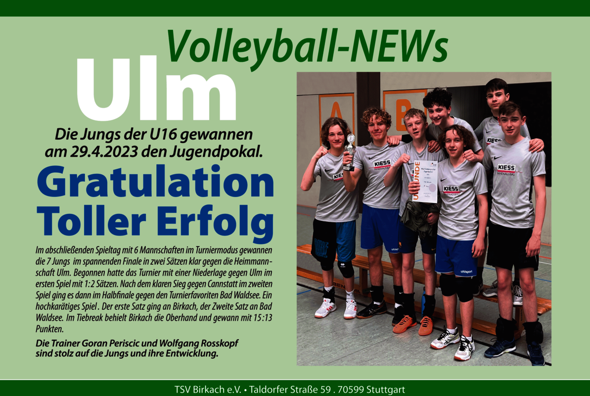 Im abschließenden Spieltag mit 6 Mannschaften im Turniermodus gewannen die 7 Jubngs im spannenden Finale in zwei Sätzen klar gegen die Heimmannschaft Ulm. Begonnen hatte das Turnier mit einer Niederlage gegen Ulm im ersten Spiel mit 1:2 Sätzen. Nach dem klaren Sieg gegen Cannstatt im zweiten Spiel ging es dann im Halbfinale gegen den Turnierfavoriten Bad Waldsee. Ein hochkarätiges Spiel. Der erste Satz ging an Birkach, der zweite Satz an Bad Waldsee. Im Tiebreak behielt Birkach die Oberhand und gewann mit 15:13 Punkten.