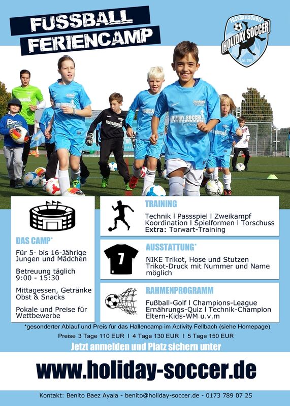 Das Fussball-Ferien-Camp ist offen für 5- bis 16-jährige Jungen und Mädchen, und verspricht viel Spaß! Es wird täglich von 09:00 Uhr bis 15:30 Uhr trainiert, geschwitzt, erholt, gegessen, getrunken, gekickt.