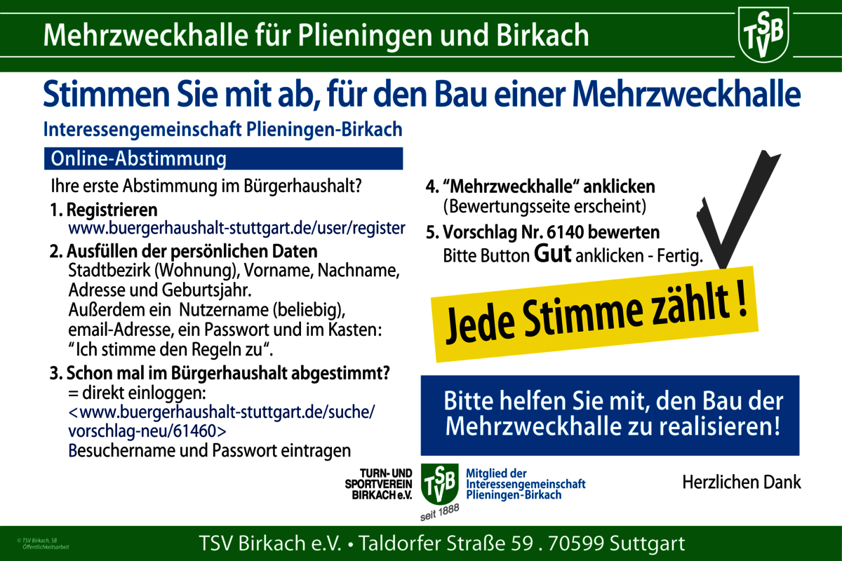 die Stadtbezirke Plieningen und Birkach brauchen dringend eine Mehrzweckhalle für Vereine, Schulen und Organisationen. Die Hallen im Stadtbezirk sind schon lange Zeit bis an die Grenzen ausgelastet. Neben sportlichen Aktivitäten sollen auch schulische, kulturelle und politische Veranstaltungen stattfinden können. Als Standort ist der Bereich westlich der Wolferhalle vorgeschlagen. In einer Online-Abstimmung können Sie für die Mehrzweckhalle mit abstimmen. Helfen Sie mit, dieses Projekt zu realisieren. (Textauszüge IG Mehrzweckhalle Plieningen-Birkach)
