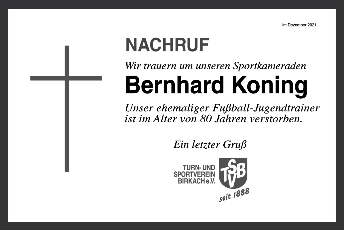 Bernhard Koning trainierte die Fussball-Jugend Ende der 80iger Jahre und ist einigen Birkachern noch gut bekannt. Herr Koning verstarb am 28. November im Alter von 80 Jahren.
