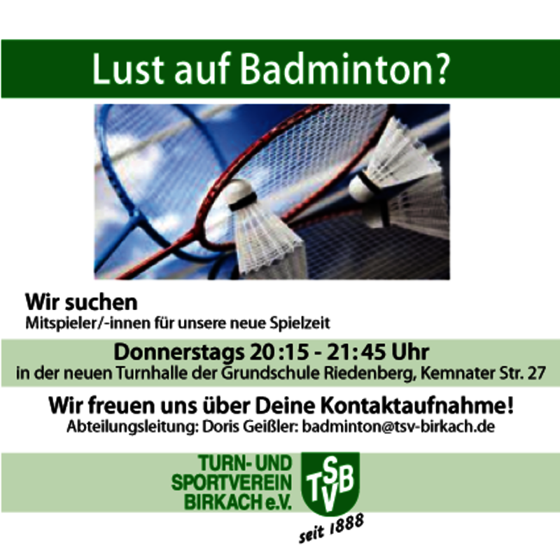 Es ist geschafft, neue zusätzliche Trainingszeit am Donnerstag in der neuen Sporthalle der Grundschule Riedenberg, Kemnater Straße 27 ab Oktober 2018! Wir können neue Mitglieder/innen aufnehmen! Bei Interesse bitte Kontakt mit der Abteilungsleitung aufnehmen: Doris Geißler, <link badminton@tsv-birkach.de - mail "Opens window for sending email">badminton@tsv-birkach.de</link>