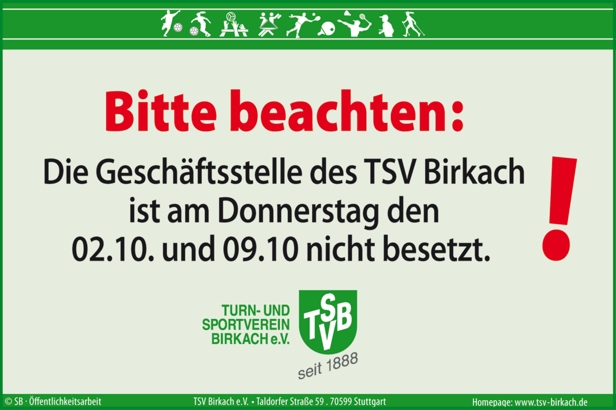 Die Geschäftsstelle ist am 02. Oktober und 09. Oktober 2025 nicht besetzt. Wir bitten um Beachtung.