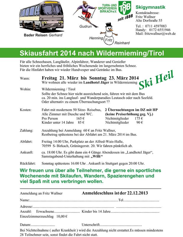 Für alle Schneehasen (Langläufer, Alpinfahrer, Wanderer und Genießer) bieten wir auch in 2014 ein herrliches und fröhliches Wochenende mit Pulverschnee und Sonnenschein in Wildermieming/Tirol, Landhotel Jäger, <link http: www.hotel-jaeger.at external-link external link in current>www.hotel-jaeger.at Wir freuen uns über alle Teilnehmer, die gerne ein sportliches Wochenende mit Skilaufen, Wandern, Spazierengehen und viel Spaß mit uns verbringen wollen, Ski Heil!