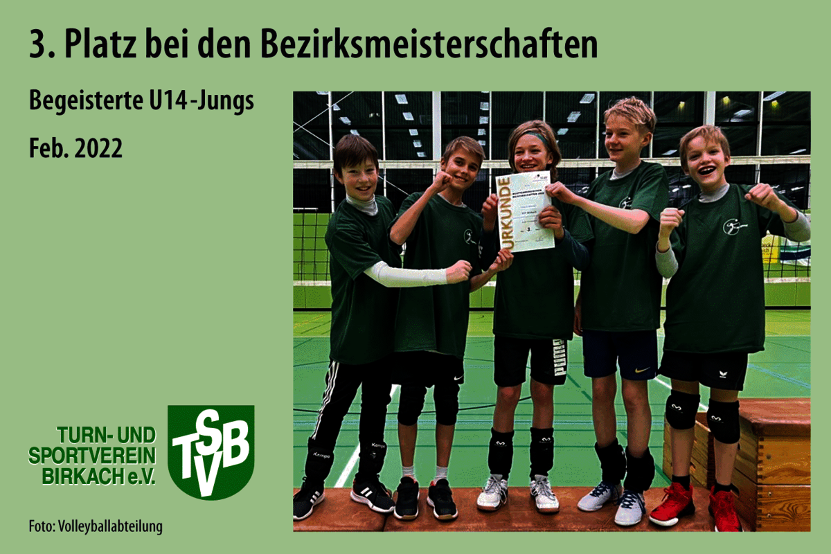 Volleyball Jungs: Die U14-Jungs des TSV Birkach wurden Dritter bei der württembergischen Meisterschaft. Sie qualifizierten sich zusammen mit dem VFB Friedrichshafen und der TG Biberach für die Regionalmeisterschaft Süd am 02.04.2022.
