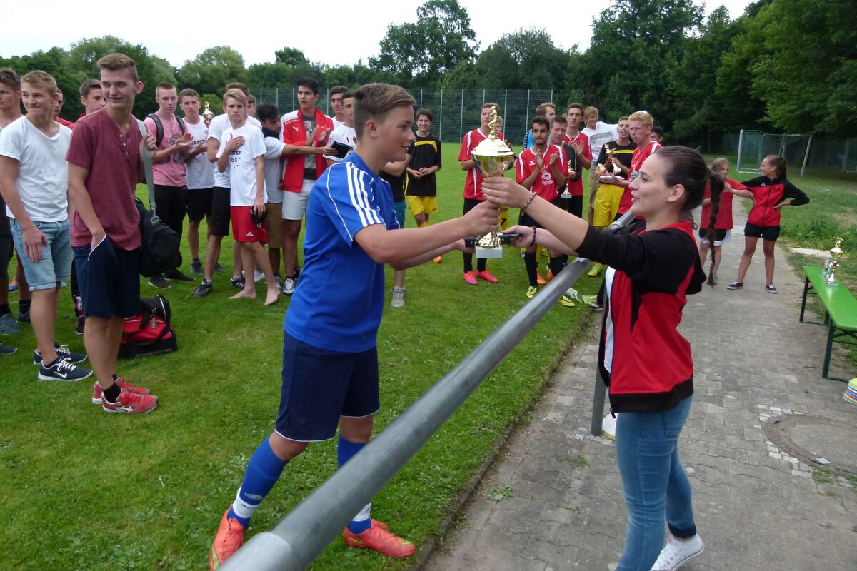 Unser „Tiger“ Philipp hatte zuvor selbst vom Punkt aus getroffen und jetzt die Chance nach erneuter Führung im Kasten die Entscheidung herbeizuführen, um sich selbst mit dem Siegerpokal zu belohnen: Hält er, sind wir durch und der „Pott“ geht nach Birkach – wenn nicht, schießen wir weiter… Aber Philipp wollte wohl heim, denn er tauchte nochmals in die untere Ecke ab und parierte wiederholt „löwenstark“ ;-) zum 6:5! Endlich war es geschafft: Turniersieg! Verdienter Turniersieg! Die über das gesamte Turnier spielstärkste Mannschaft hat den Pokal mit nach Hause genommen. Und nicht „nur“ diese Trophäe, unser Nik hat als bester Torschütze der Vorrunde auch einen Pokal erhalten. Es war eine super und geschlossene Mannschaftsleistung, in der kein Spieler im Laufe des Turniers abgefallen ist. Im Gegenteil: Leon Köhler und Philipp Linhartspielten mit Unterstützung ihrer Kameraden das Turnier ihres Lebens!